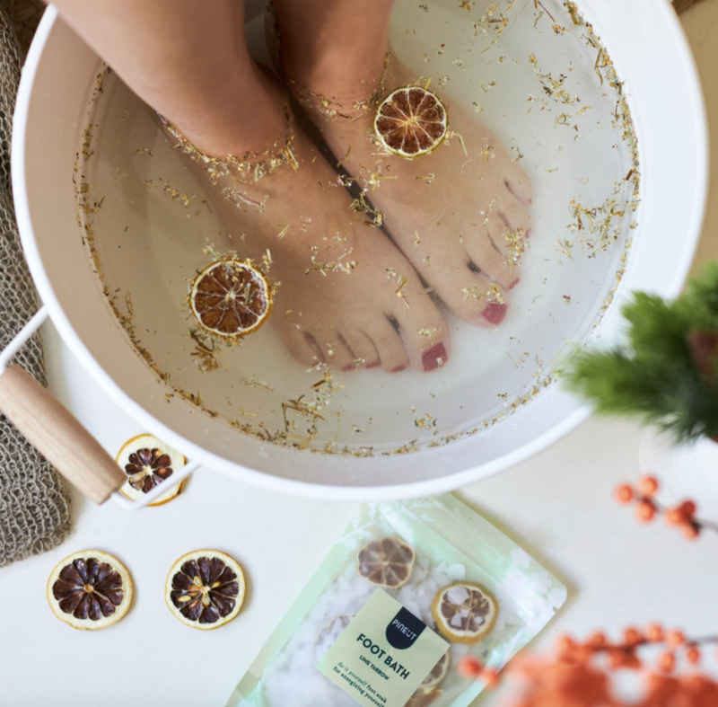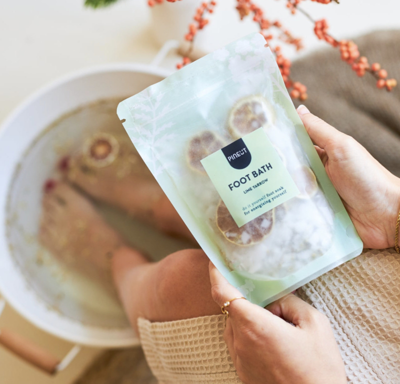 Voetenbadje Brievenbuscadeau. Een mix van natuurlijk magnesium, limoen en duizendblad zorgt voor pure verwennerij.