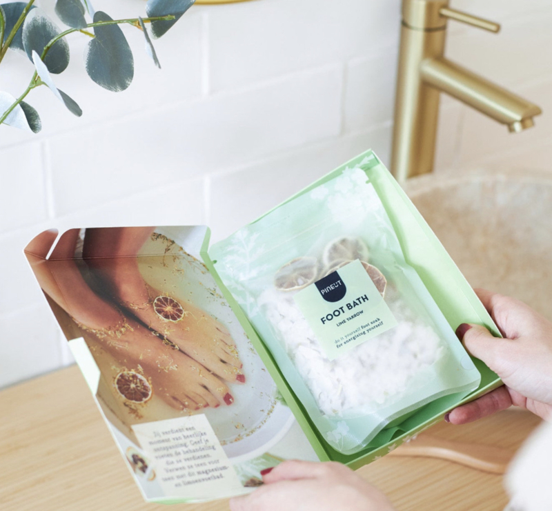 Voetenbadje Brievenbuscadeau. Een mix van natuurlijk magnesium, limoen en duizendblad zorgt voor pure verwennerij.